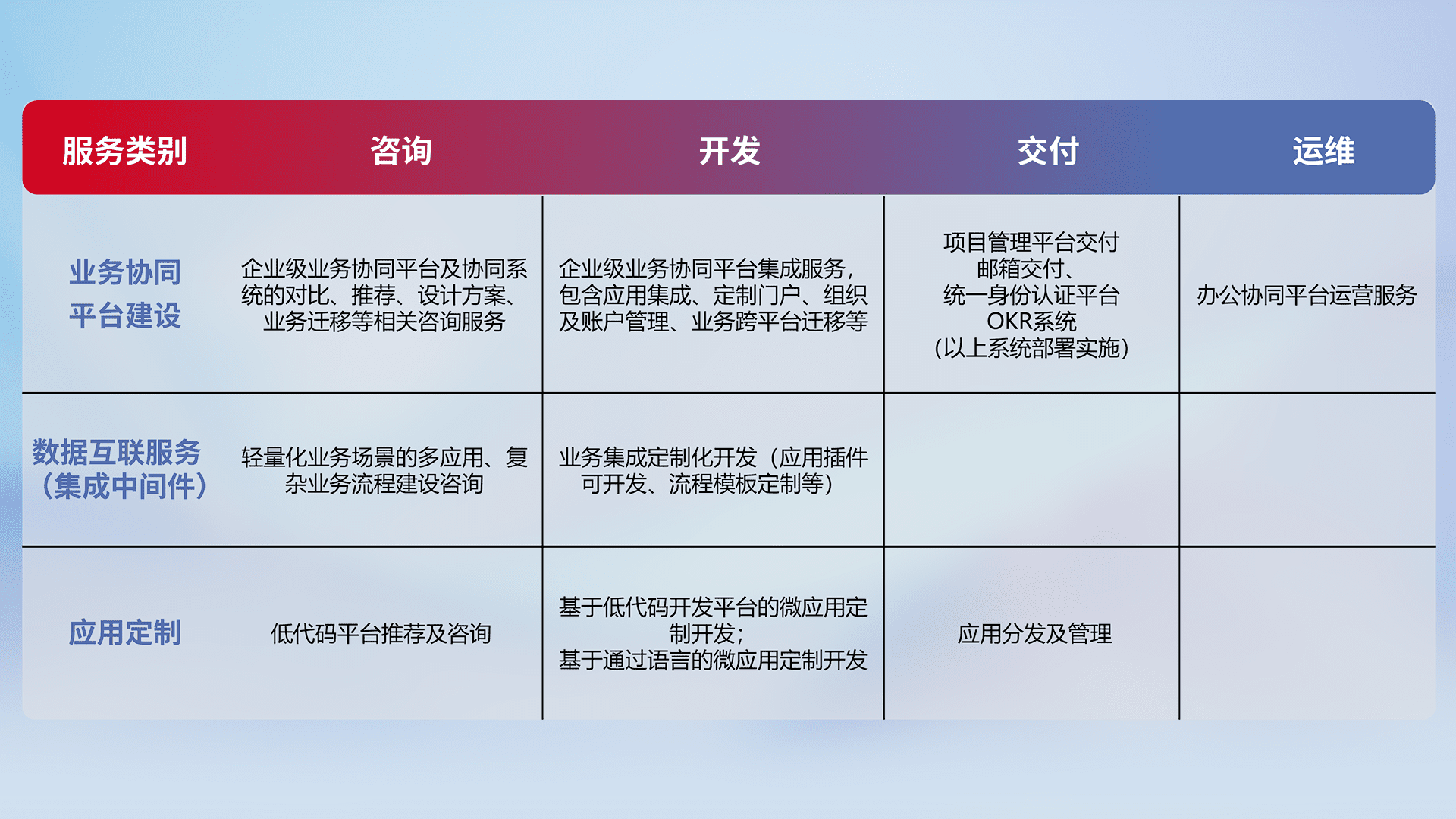 针对钉钉、、、企微、、、、IDaas等平台级产品提供产品的规划、、方案、、、、交付、、、、定制化开发等服务,,实现如统一协同办公、、、、智能客户服务、、、混合会议管理、、、、智能数据查询、、、、等业务场景,,实现数字化转型。。