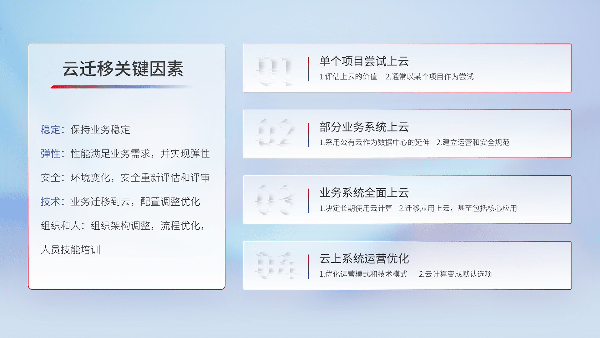 结合实际业务,,,从规划设计、、云平台选型、、、、云原生改造、、数据迁移、、集成交付,,,,迁移全过程为客户识别最佳上云路径,,,,做好风险识别管理,,设计网络架构、、身份权限、、安全审计合规、、、操作审计、、日志审计、、、、监控告警策略、、、、多站点容灾设计等,,,,对云上基础设施进行整体规划,,提升IT治理水平,,,,以满足弹性、、、高可用、、高性能的需求。。。