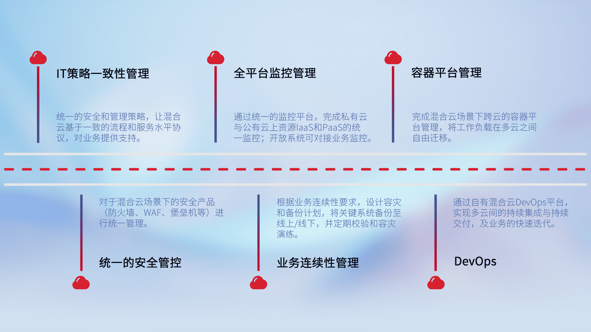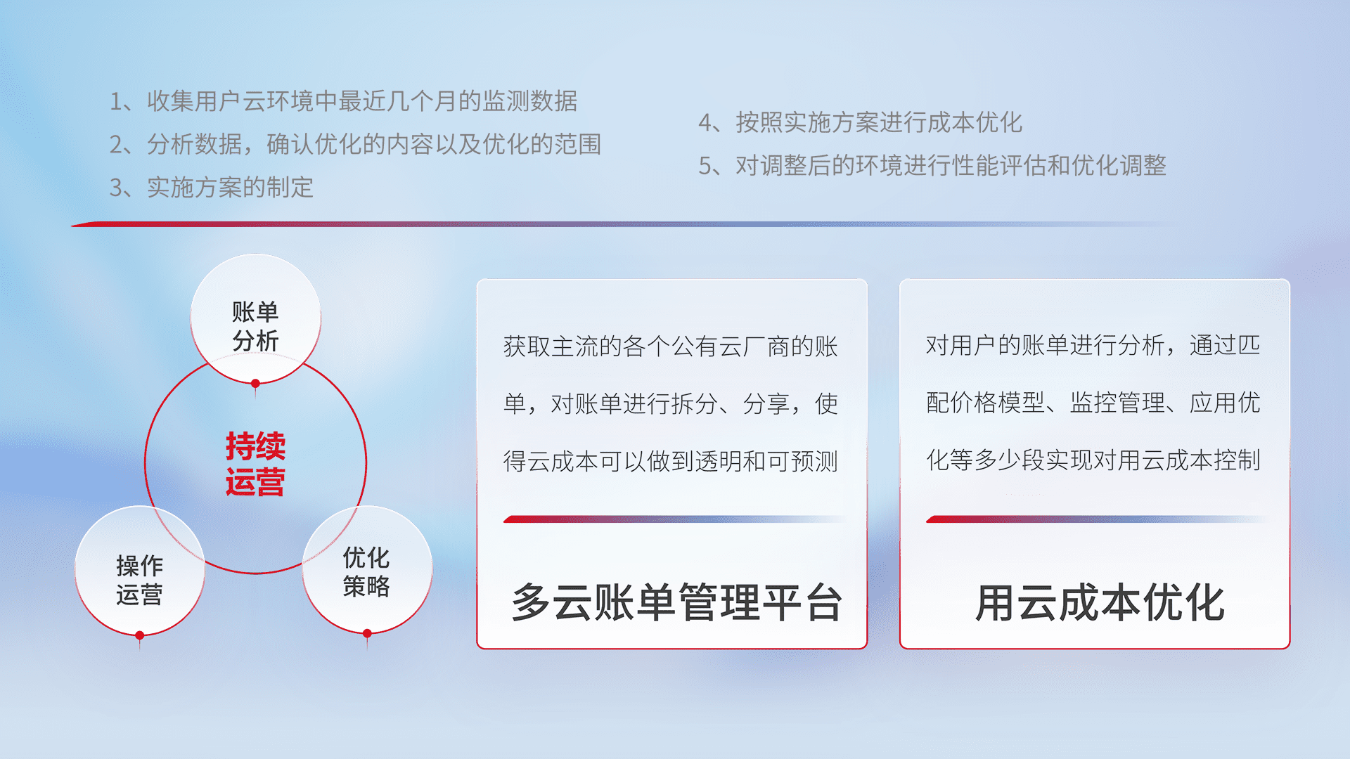 通过多云纳管,,以统一的资源数据模型把客户的云资源进行抽象和封装,,进而实现对多云资源的统一操作,,,,保障云资源管理的可靠性、、、、稳定性与可用性。。。量身定制化运维内容,,,配置、、、、开发运维、、、、补丁管理、、、、备份、、监控、、认证和访问管理、、、、审计和日常巡检等,,保障在用云过程中的可靠度,,稳定度以及高可用率。。