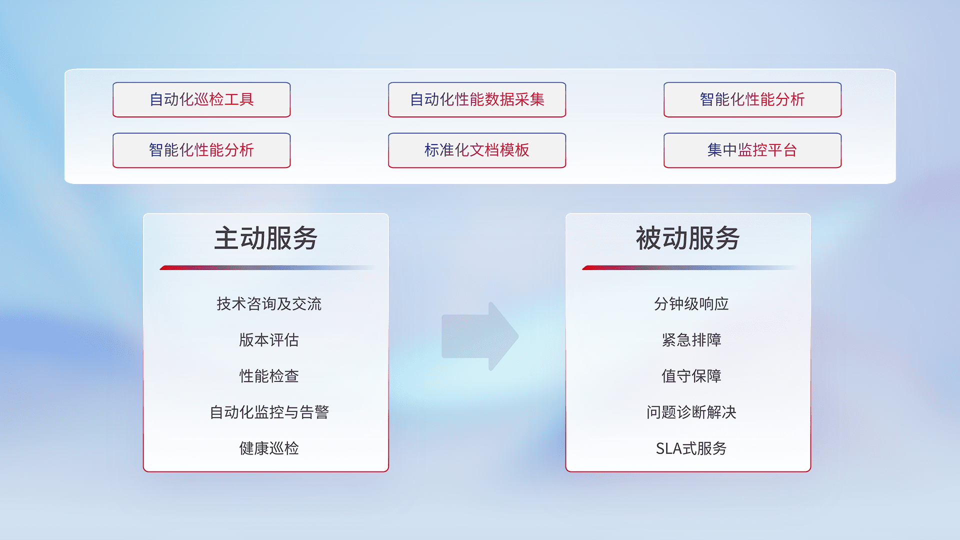 智能化工具和标准化文档,,,,保障服务质量,,,,提供主动服务(包含技术咨询、、、版本评估、、、性能检查、、自动化监控与告警、、、、健康巡检)和被动服务包含(分钟级响应、、紧急排障、、、值守保障、、、、问题诊断解决、、、SLA服务)。。。。