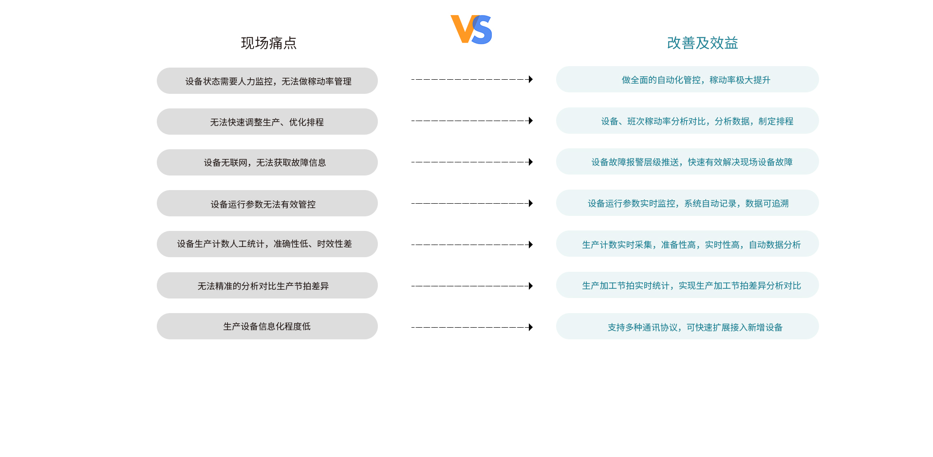 设备实时状态采集(运行、、空闲、、报警等状态)及设备利用率分析,,,提高设备运行效率,,调整产线平衡,,,,消除生产瓶颈。。。。设备运行参数采集分析,,,提高生产产品质量,,,并记录生产数据,,便于质量追溯。。。。实现对全厂设备实时监控,,, 并通过数据报表及实时预警提示,,,,辅助设备运维管理。。